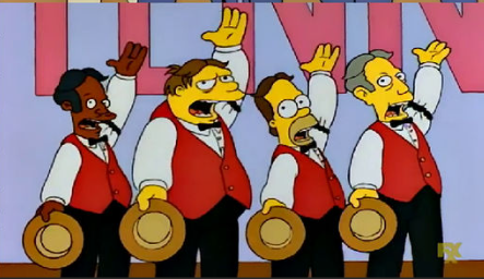 The 1980’s brought satire and humor into the mix when The Simpsons’ debuted their very own barbershop quartet, The Be Sharps. Formed by Homer, Apu, Skinner, and Barney, the group’s hit “Baby on Board” hilariously mirrored the boy-band and doo-wop revivals of the era.