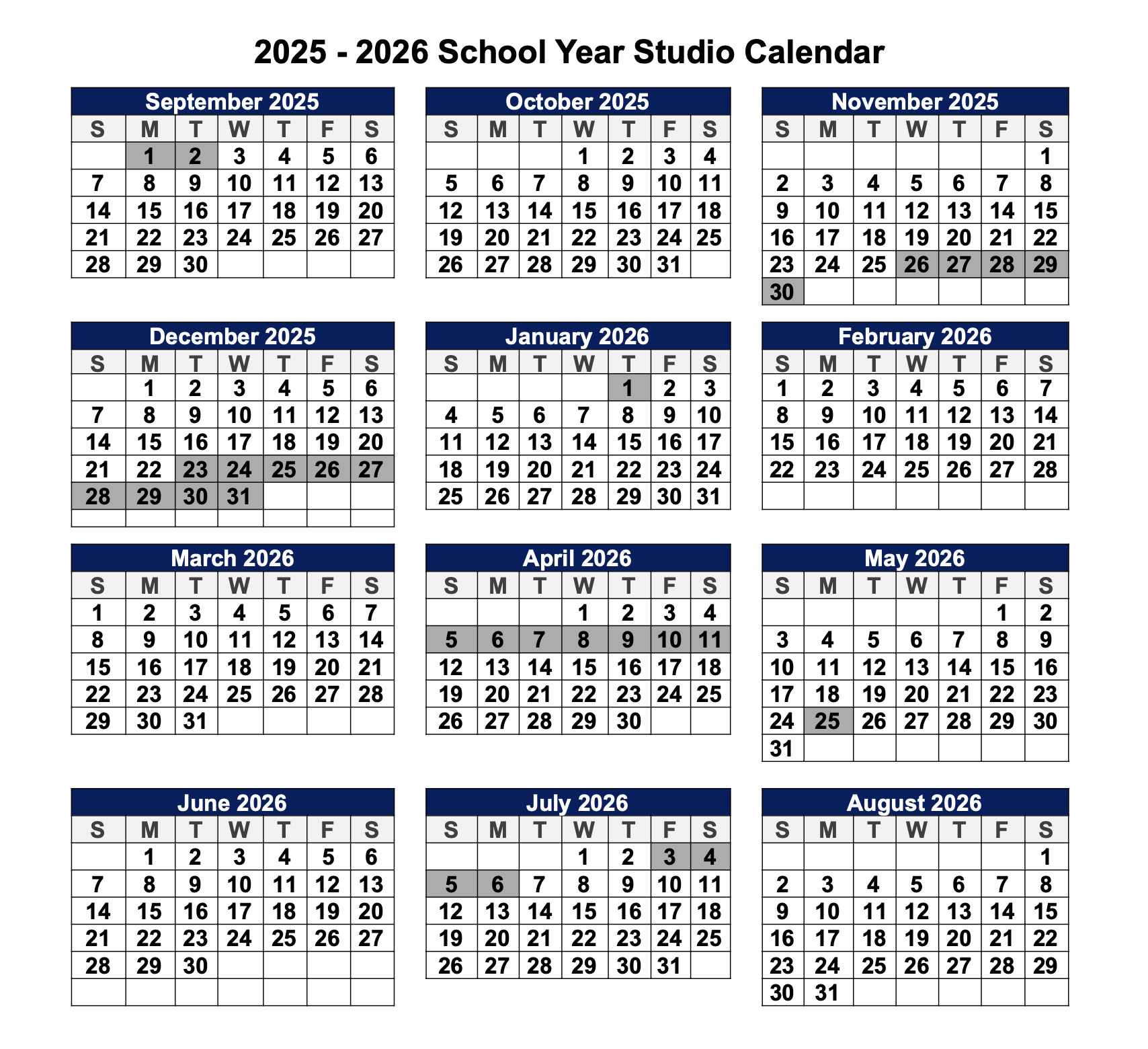 School Calendar 2025 – 2026 School Year Studio Calendar School Closures: September 1-2 – Labor Day November 26-30 – Thanksgiving December 23-January 1 – Winter Break April 5-11 – Spring Break May 25 – Memorial Day July 3-July 6 – Summer Break