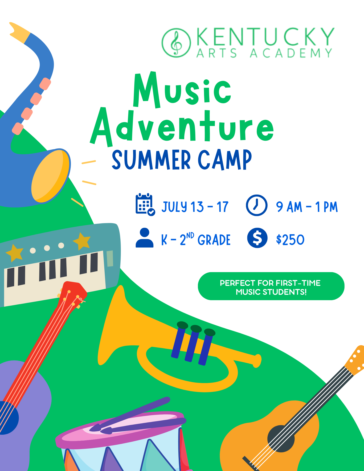 Objective: A fun, week-long musical journey where young students sing, move, play instruments, and explore music through games, stories, and creative activities. No experience required. Perfect for first-time music students.