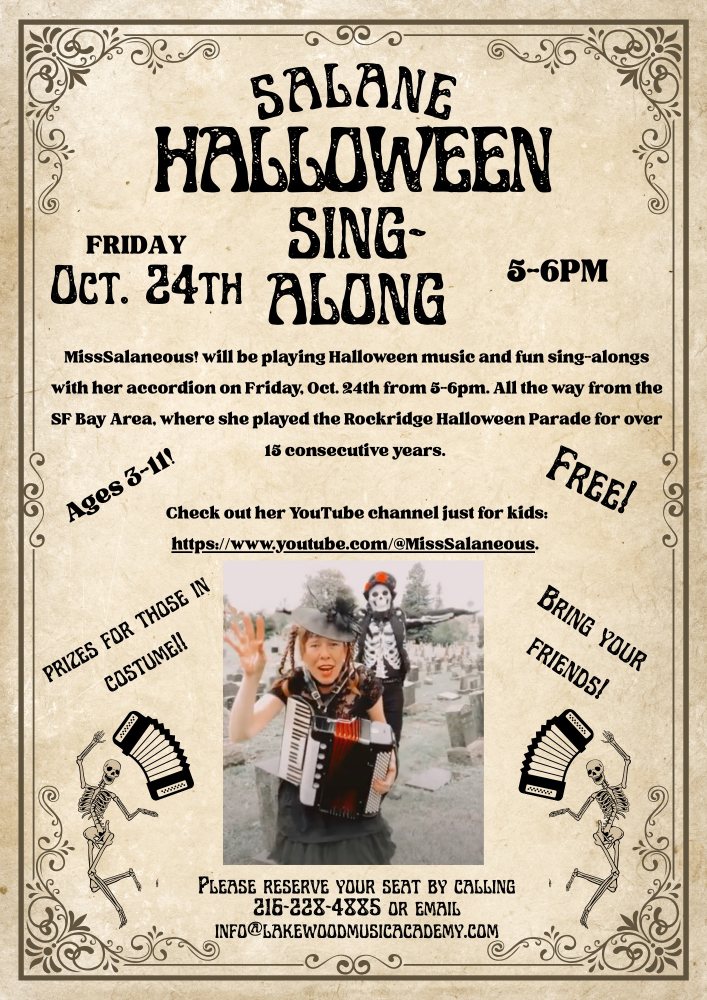 On Friday, October 24th, from 5-6 pm, enjoy a special Halloween Sing-Along with MissSalaneous! Sheβll be playing spooky and fun Halloween music on her accordion, leading sing-alongs for kids ages 3-11.
